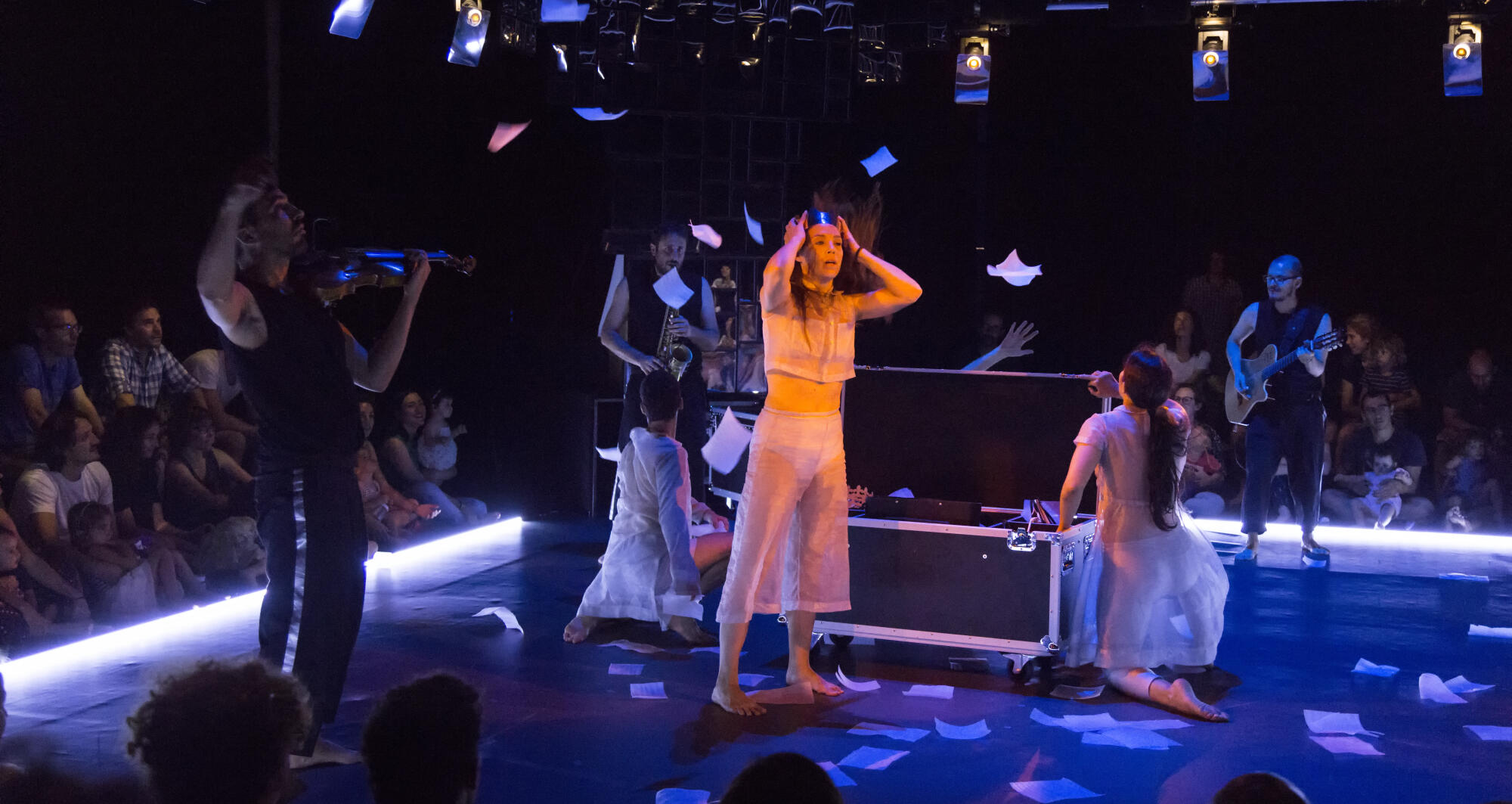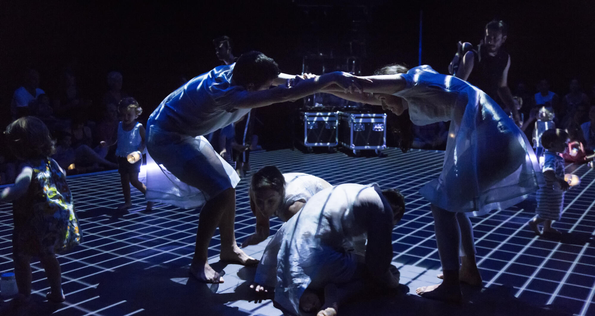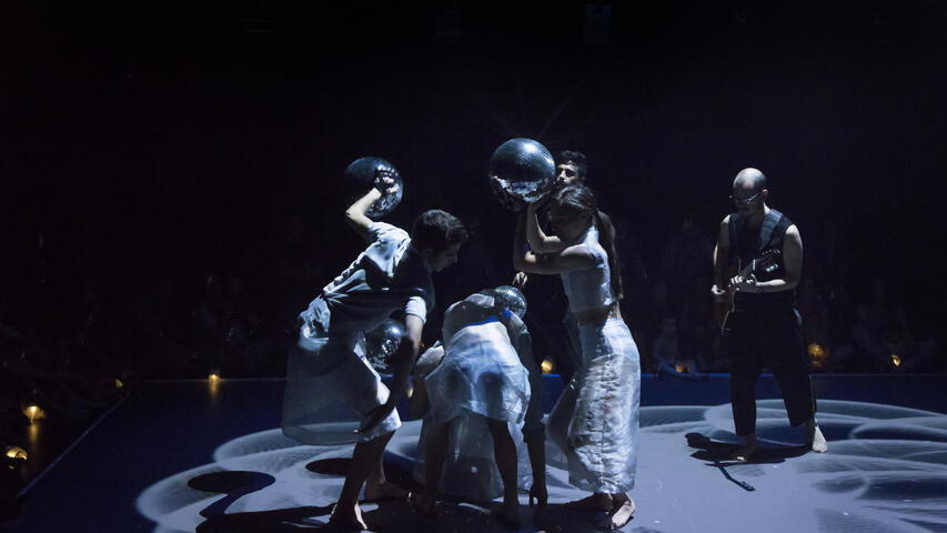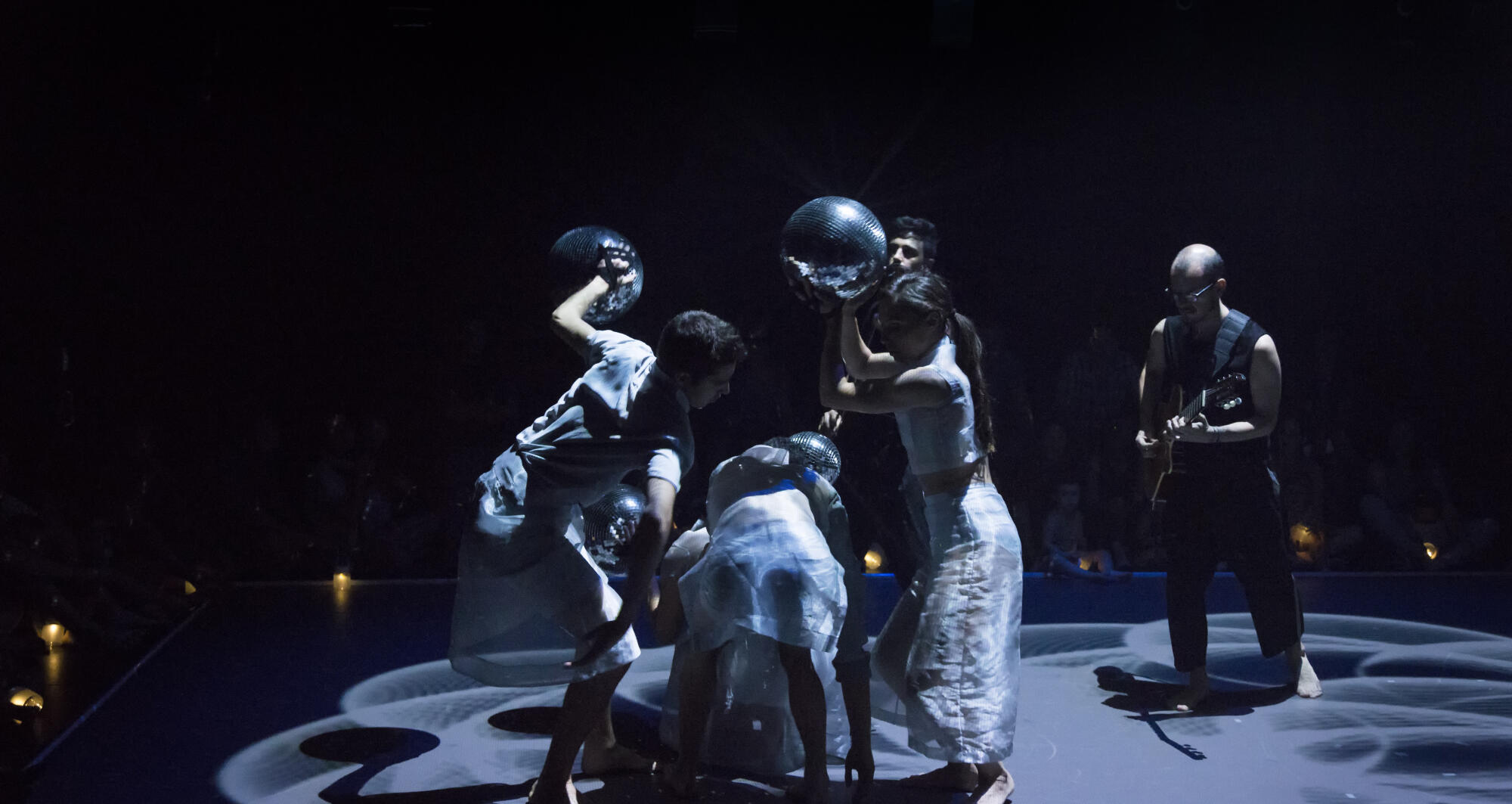 Figures que ballen. Accions reflectides en el mirall. Músics eteris i invisibles que observen i acompanyen.