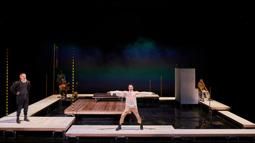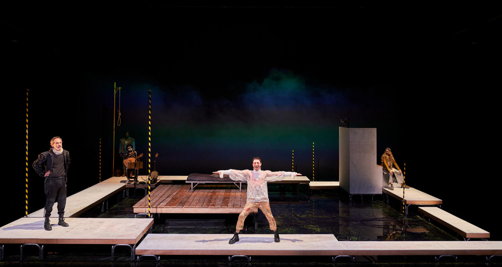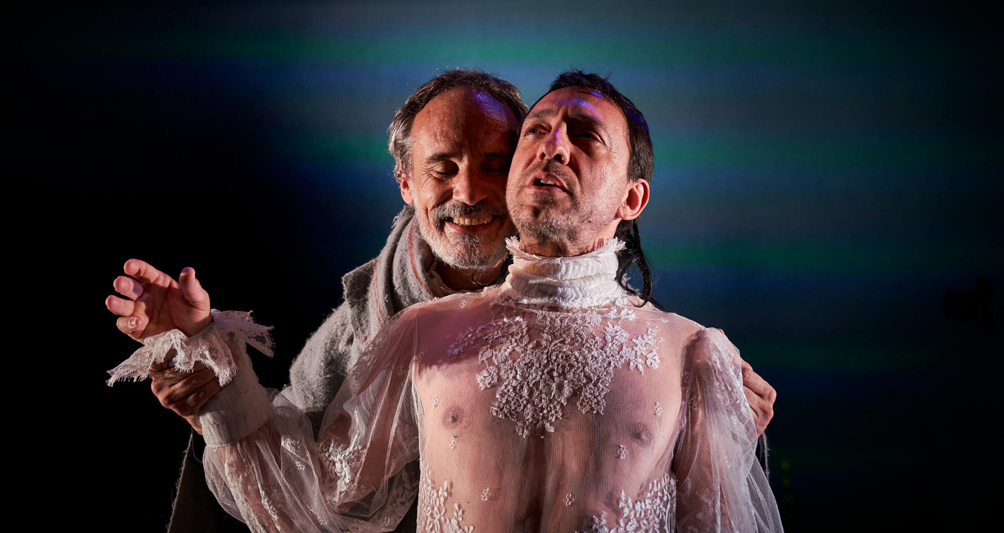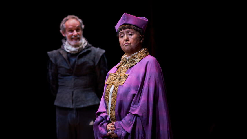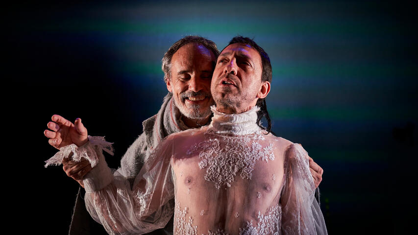 In order to recreate the streets of Brugge in the 16th century, the scenography of this show was designed so that water played a predominant role. Due to ecological responsibility, TNC's commitment to the sustainability and because of the drought we are suffering, we have decided not to fill the stage floor with water and replace its poetic effect with video and smoke. However, and to contribute to the narrative of the play, it has been inevitable to use a minimum quantity of water, which is recycled and reused every day for other uses.